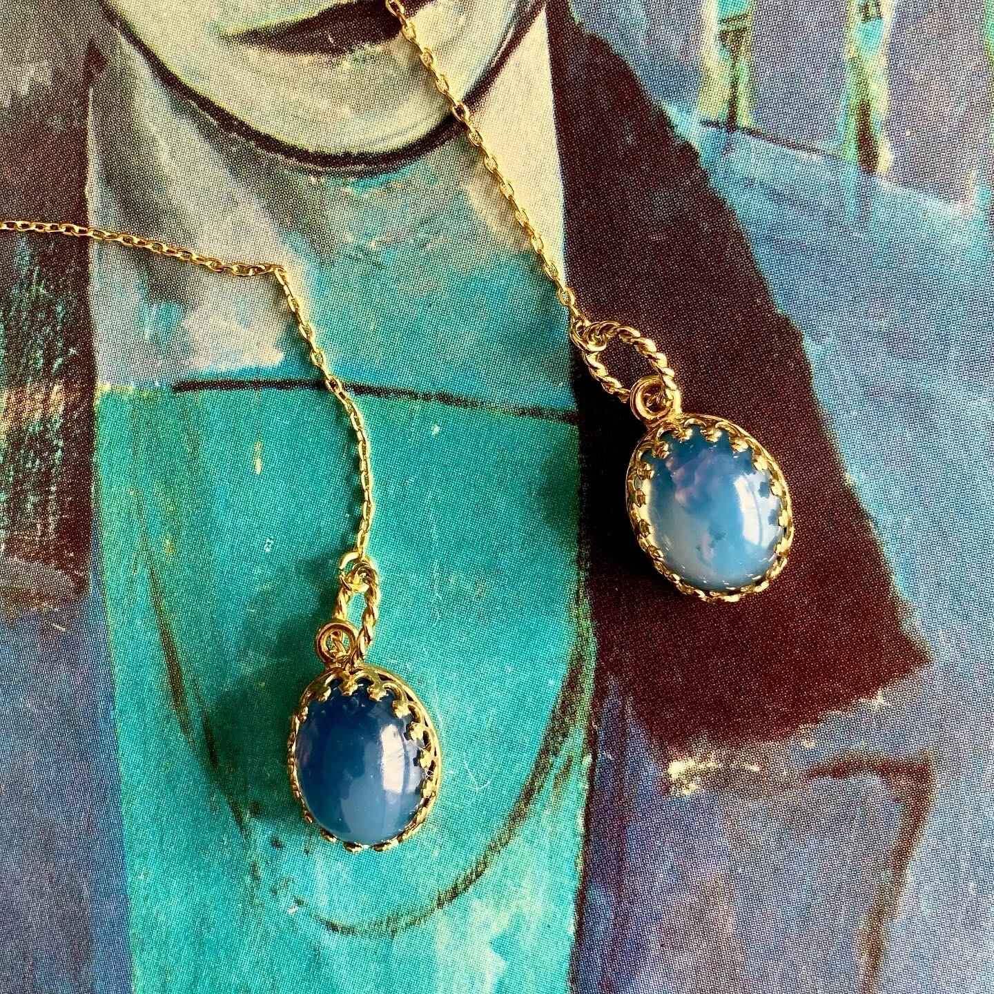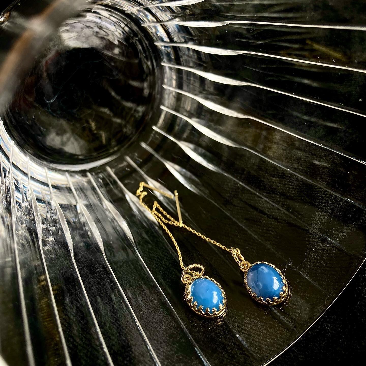 こちらのブルーのカボションも色がとても綺麗なので、台座をフレーム型にして、光りが抜けて透明感が出るようにしました。