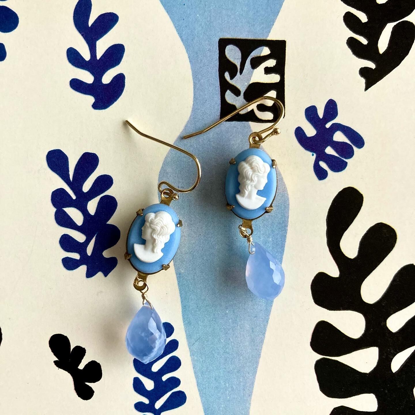 水色のベースに白プロフィールのカメオに下げた、ペールブルーのティアドロップは、天然石(半貴石)です。